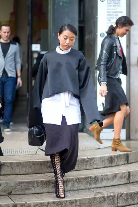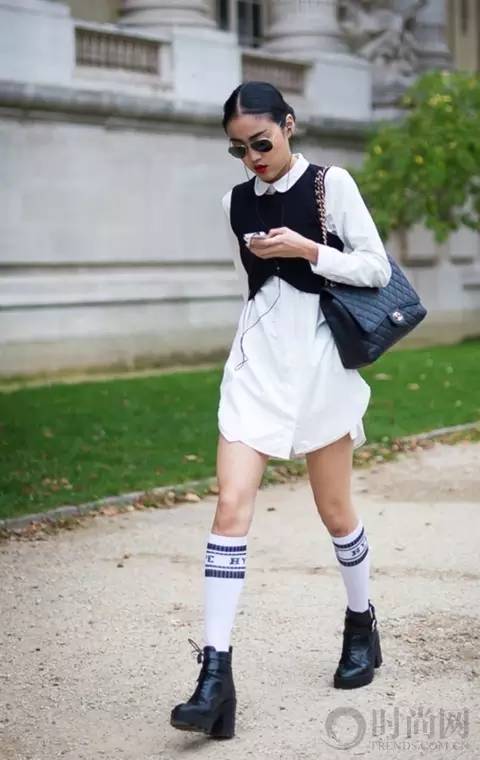 截短款针织衫搭配白衬衣简单有型,下衣消失的穿法更加性感,及膝长袜和粗跟短靴尽显青春活力。
