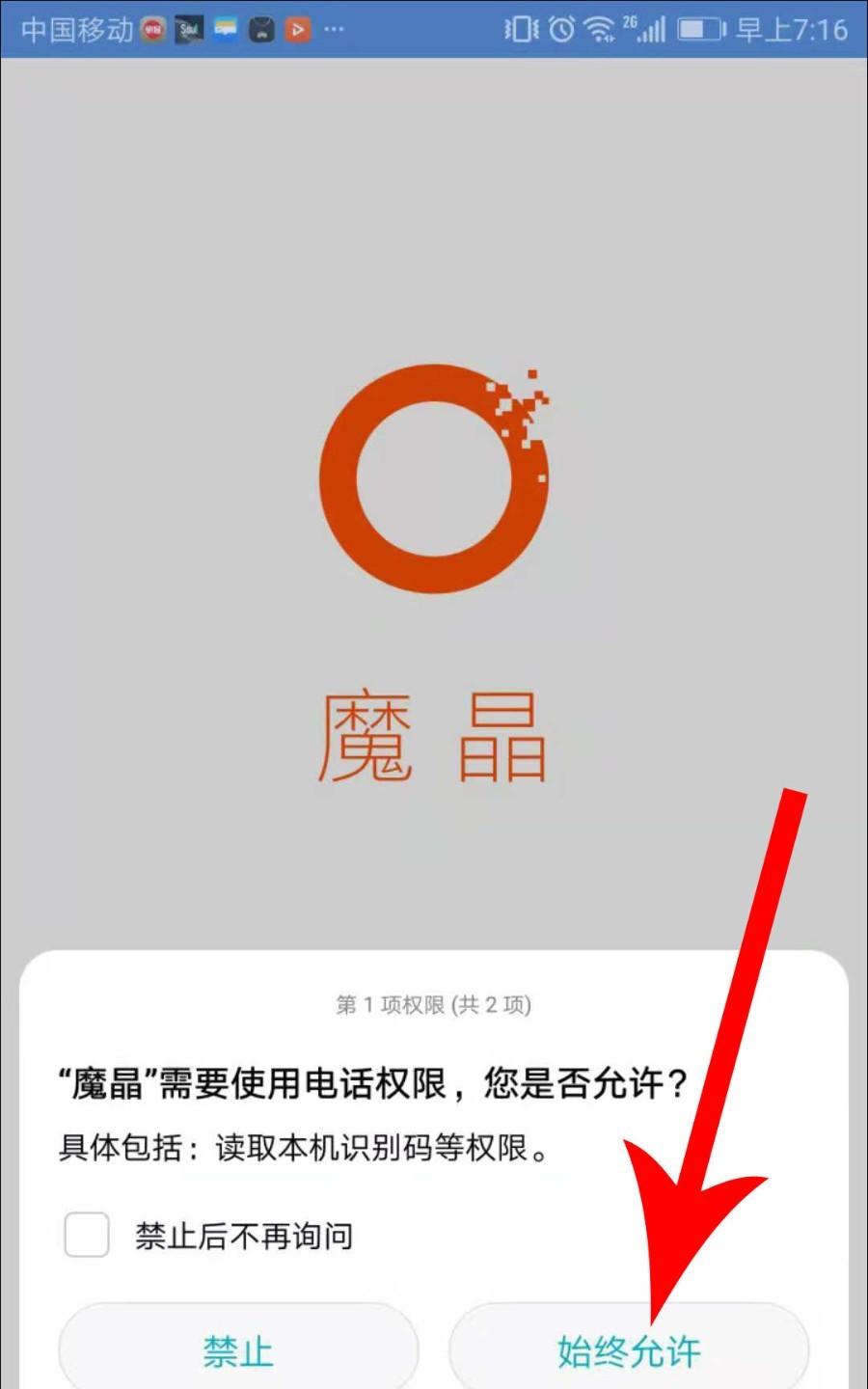 魔晶需要使用电话权限、存储权限,点击“始终允许”