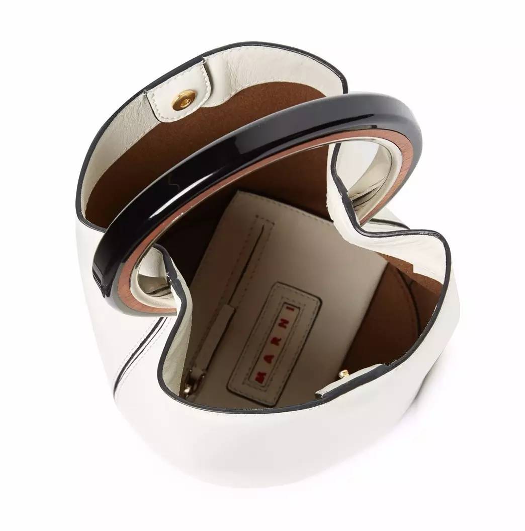 Marni 2016年秋冬系列里就有一款金属圆环的牛皮手拎包,粗圆环反而还有点可爱,而且好拿,包里放多一点东西也不会勒手。有棕色和白色款的。▼