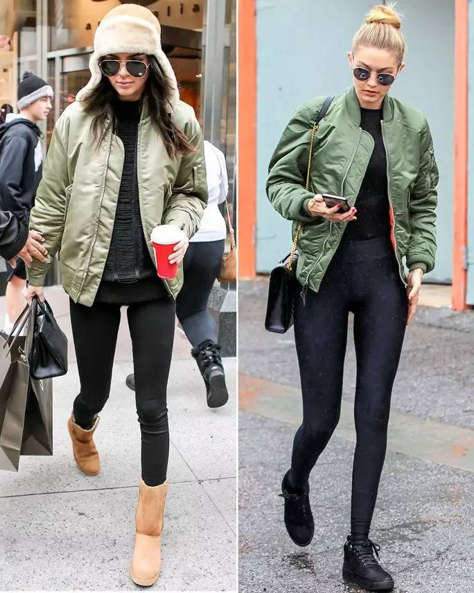 飞行员夹克的免费推广员肯豆和 GIGI 告诉我们,这种夹克配 LEGGING 才是正解。