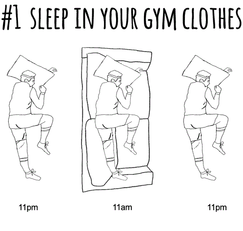 首先,请把运动服当做睡衣,这样早上起来就不用进行更换运动服这个步骤便可直奔健身房。一个更贴心的建议是,平常也可以穿着运动出门,这样可以造成一种“我无时无刻不在运动”的美丽错觉。