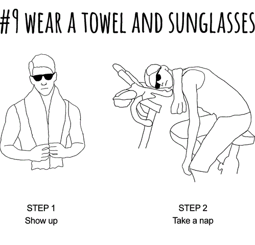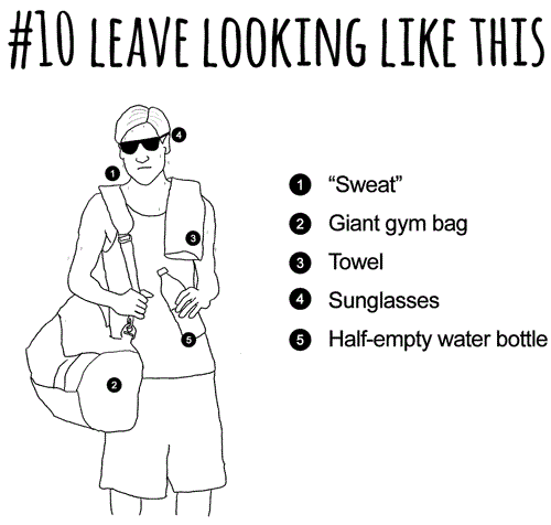 首先,在健身房里戴太阳镜(自我感觉)很酷,而且也没人能发现你熟睡的双眼,其次,脖子上要挂一条微湿的毛巾,佯装出汗的样子,最后,眼神中传达对所有人的冷漠和鄙视,脸上挂着“一天到晚都待在健身房好无聊哦”的睥睨感。10. 如何专业地离开健身房