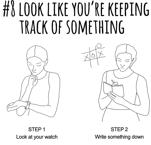 手上戴一个智能手表,一定要上面有很多复杂的定时器、秒表、数值的那种,然后装作若有所思的样子重复计时,仿佛在数着什么东西并掏出笔记本画点什么——一种专业。