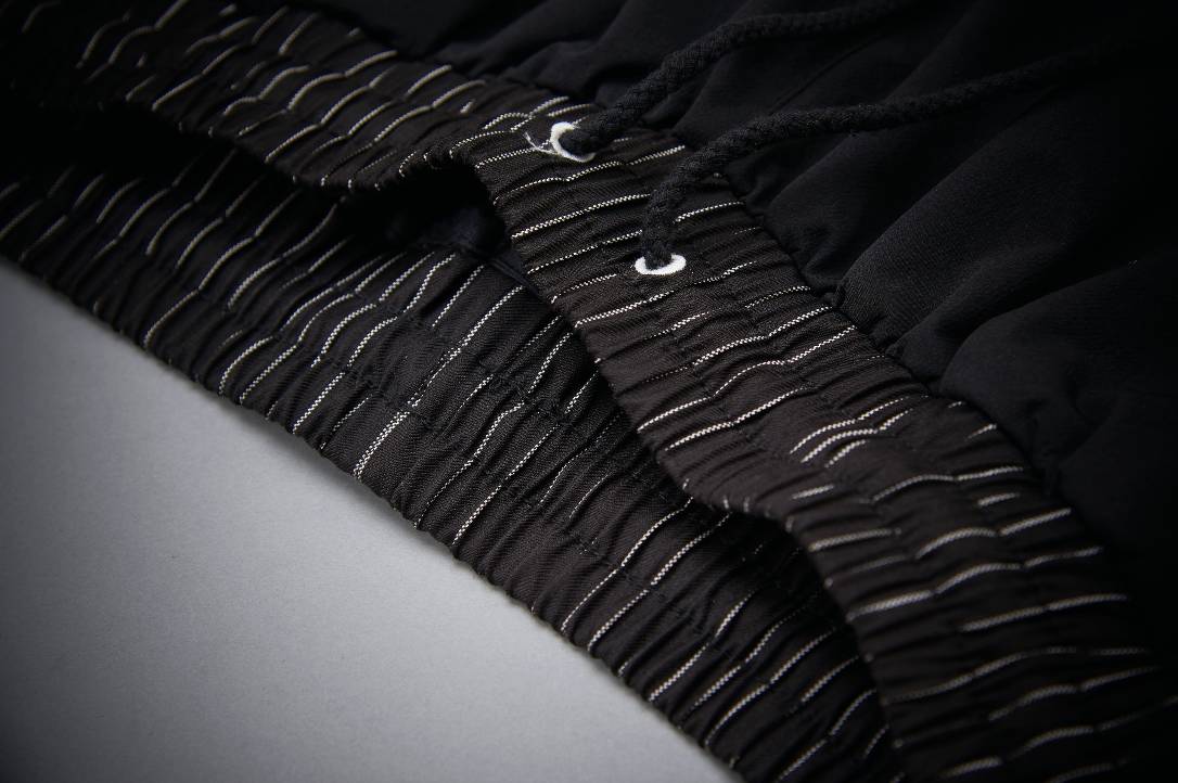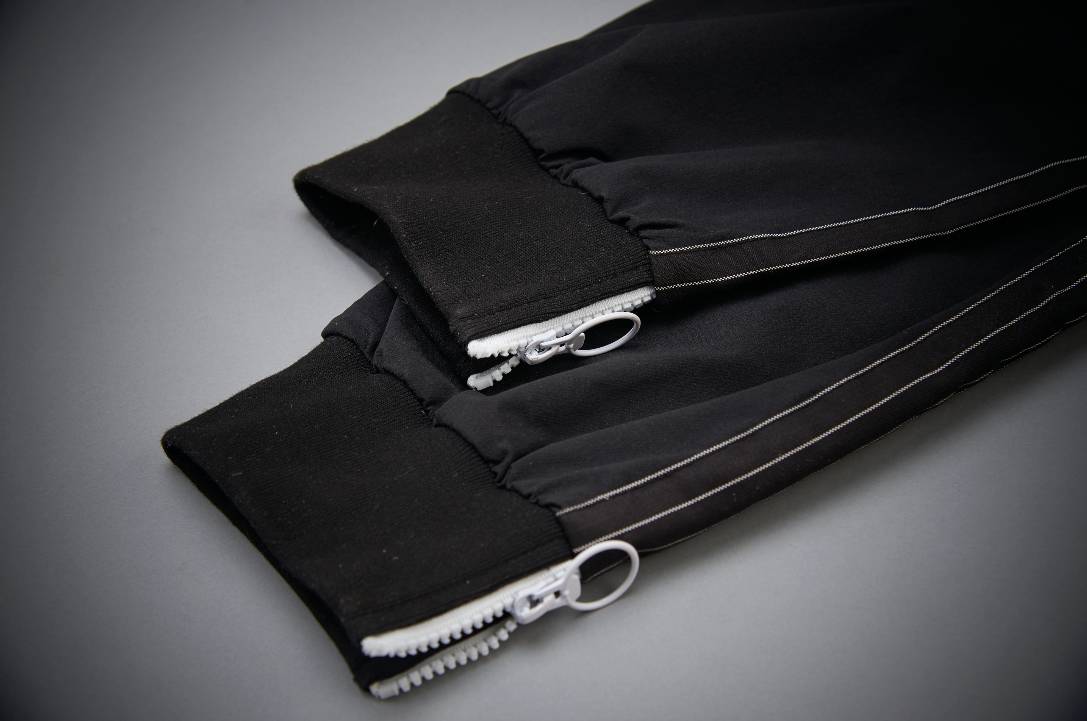 裤子也是诚意满满,注意细节的你肯定会留意到裤头的设计,在松紧带间加入了西裤条纹,还有裤脚的拉链,这种程度的出品我给满分!