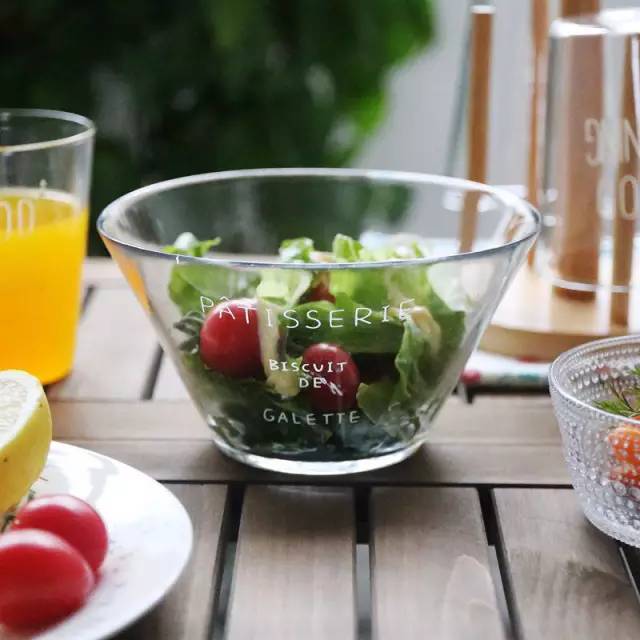 小清新的法文字母透明玻璃碗,可以装沙拉。把酸奶麦片放在里面也一定很有食欲,嗯!